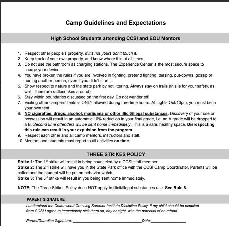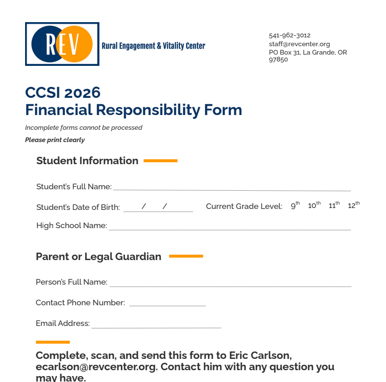 While a portion of the CCSI program fee may be covered through our available scholarship fund, we require a completed financial responsibility form confirming a parent or guardian will assume responsibility for payment of any remaining balance. Download the form >
