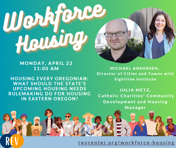 REV hosts regular online talks about housing. The most recent talk, “Housing Every Oregonian” held April 22, was well attended with engaging. REV is working to keep ideas proposed in this talk continuing and growing. View it here. Speakers were Michael Andersen, Director of Cities and Towns with Sightline Institute, and Julia Metz, Catholic Charities’ Community Development and Housing Manager.