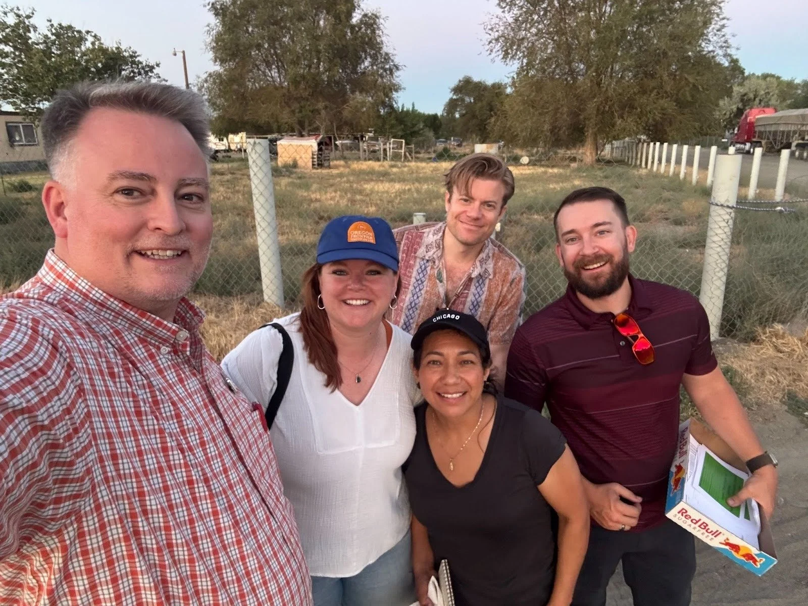 Door knocking in the West Glen community: From Left to Right, Morrow County Administrator Matthew Jensen, Grace Donovan, EOU Professor Dustin Ellis, Ana Maria Rodriguez, Morrow County Commissioner Gus Peterson.